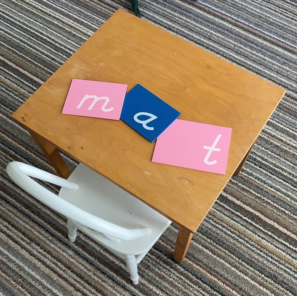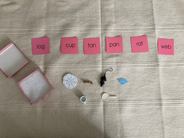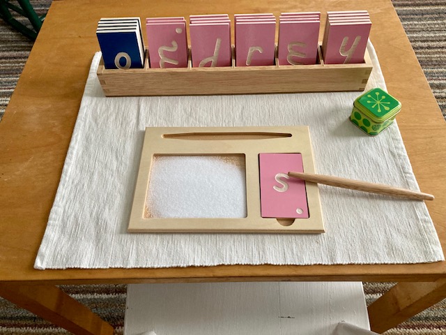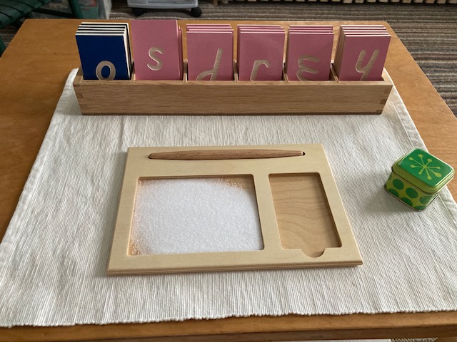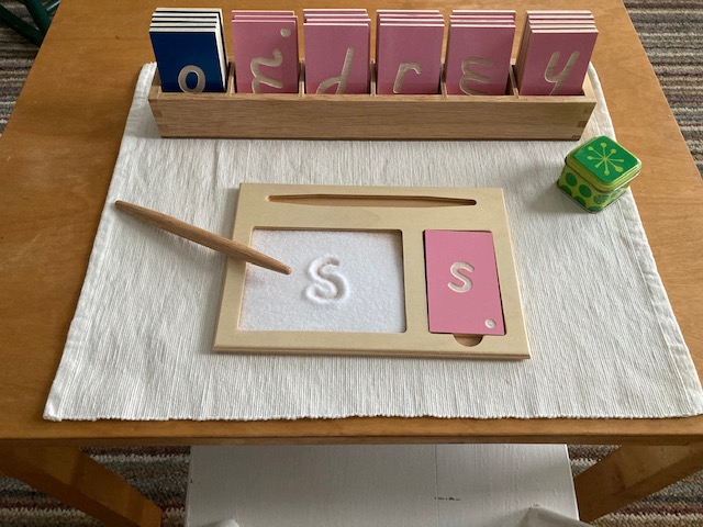The curriculum continues with sandpaper letters, individual sounds and concrete objects that begin with the isolated letter. Small groupings of individual sounds are taught. Then the child displays his mastery of those sounds by choosing the correct object to correlate with the beginning written sound.
