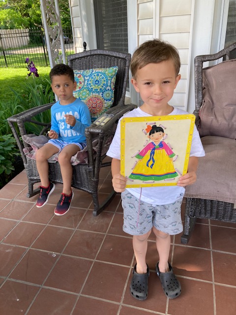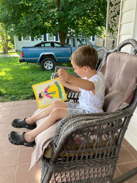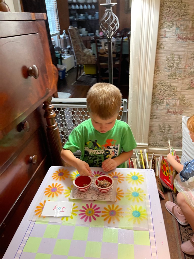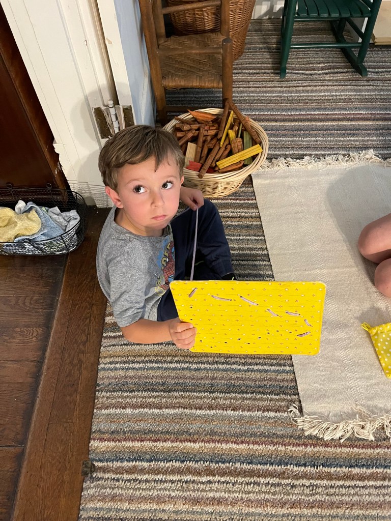 Montessori educators usually do not reward children’s work with stickers or awards because we believe the reward is in the work. The reward is the satisfaction that comes from trying hard, improving at a task/skill and then taking pride in what you have learned. The reward is the work itself. I believe this fuels the child’s interest and tenacity to take ownership of his/her own learning and to take great joy in what he/she does. This little guy was so proud of his lacing work – and anyone who has ever tried to teach a child to sew or lace something complex will know that it was quite an accomplishment for a four year old! Now he can build on that skill to begin sewing, patterning and all sorts of other detail oriented, more difficult works.