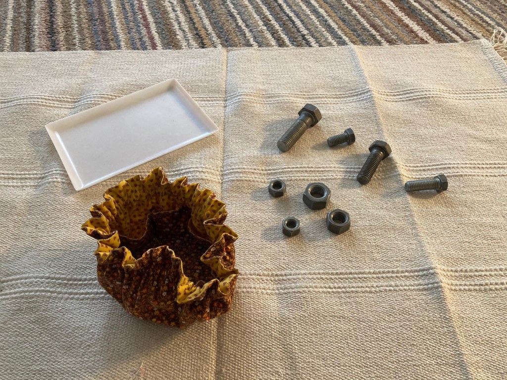 For example, there is this great lesson about nuts and bolts. An interesting draw string bag with interior pockets holds 4 bolts in the center and 4 matching nuts hiding in the pockets. The child opens the bag, discovers the bolts, finds the nuts in the pockets and the proceeds to match and thread the nuts and bolts. Once the child has threaded the matching nuts to their bolts, he dissembles them, replacing all of the pieces where he found them, making the lesson beautiful for the next person. There are many skills involved in this simple lesson: sequencing, matching, threading – but to the child it is simply something they get to “do.”